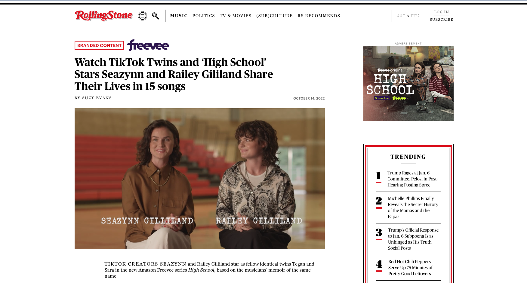 Merging advertising and editorial, I worked with Rolling Stone and Amazon to create this promo piece for an upcoming freevee show in the style of Rolling Stone’s iconic “My Life in 15 Songs” series.